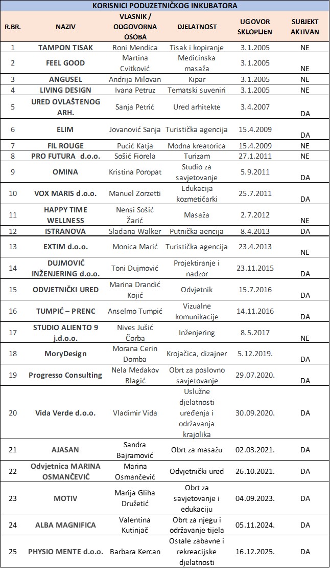 Prema saznanjima, od 17 poduzetnika/obrtnika koji su boravili u Poduzetničkom inkubatoru samo 4 korisnika nisu nastavila sa svojom poduzetničkom djelatnošću.