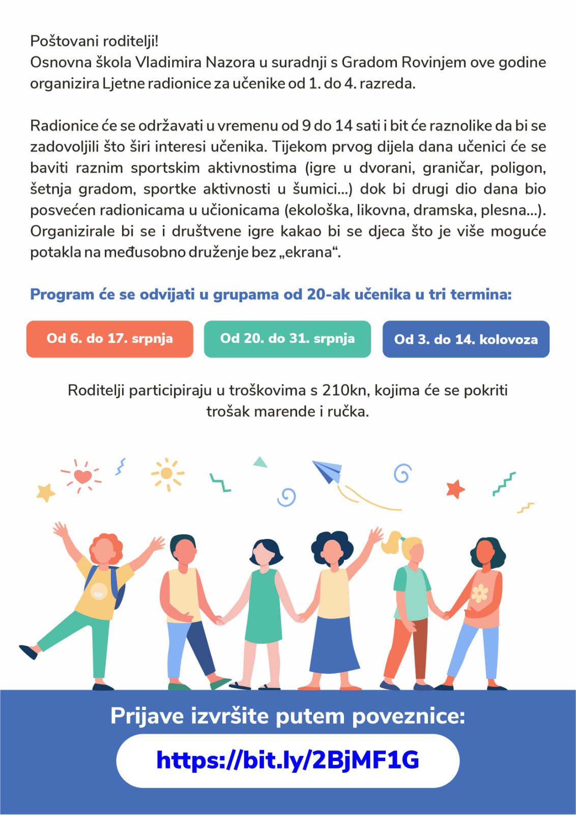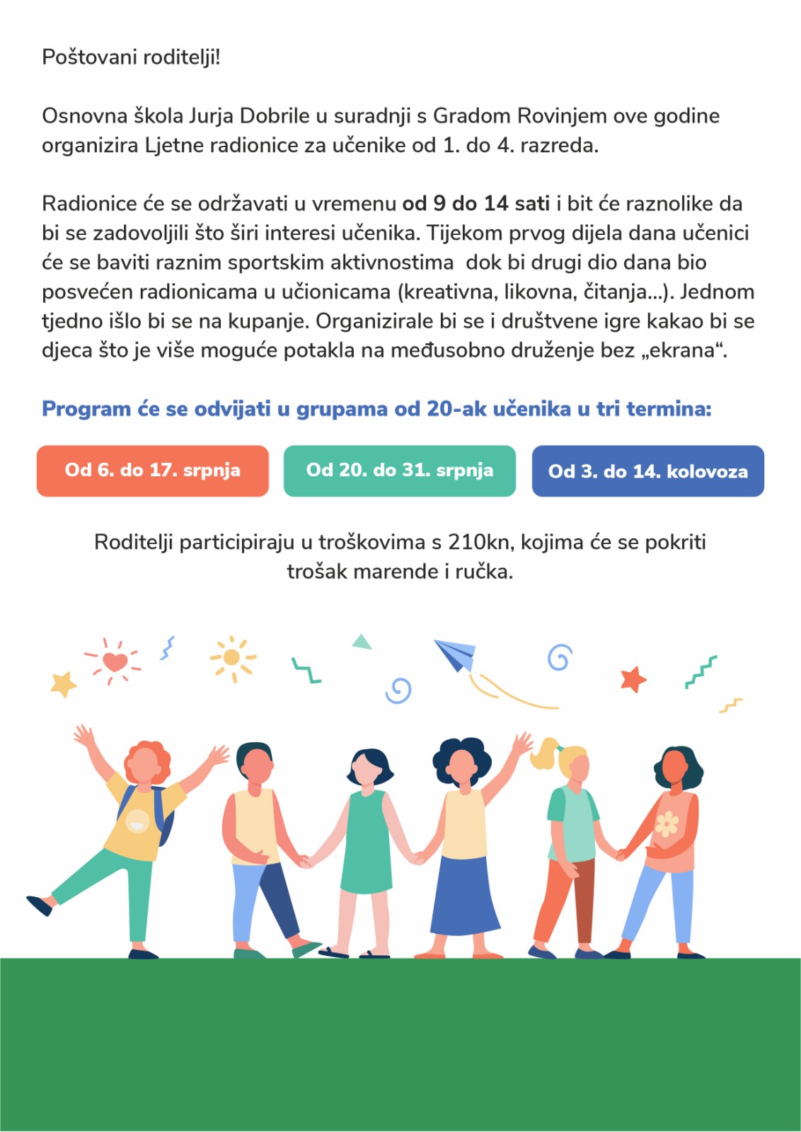 Le SDcuole elementari di Juraj Dobrila, Vladimir Nazor e la Scuola elementare italiana “Bernardo Benussi”, in collaborazione con la Città di Rovinj-Rovigno, organizzeranno quest’anno laboratori estivi per alunni dalla prima alla quarta classe.