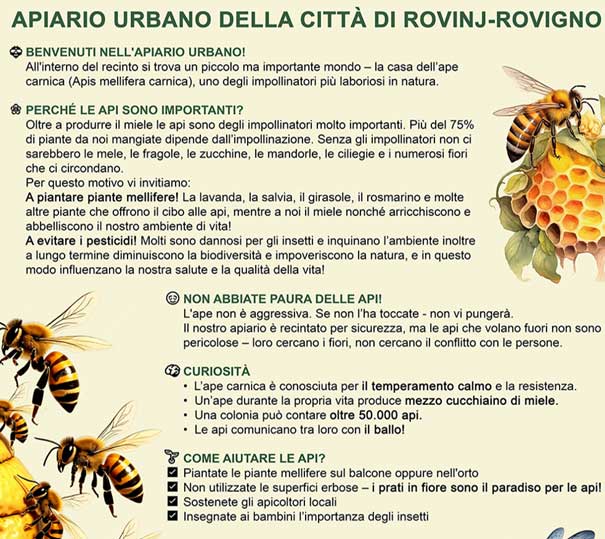 La Città di Rovinj-Rovigno ha celebrato la Giornata della Terra, il 22 aprile 2025, installando il primo apiario urbano sul proprio territorio. Con questa iniziativa, Rovigno si unisce alle città che agiscono attivamente e concretamente per la tutela della natura, delle api e della biodiversità.