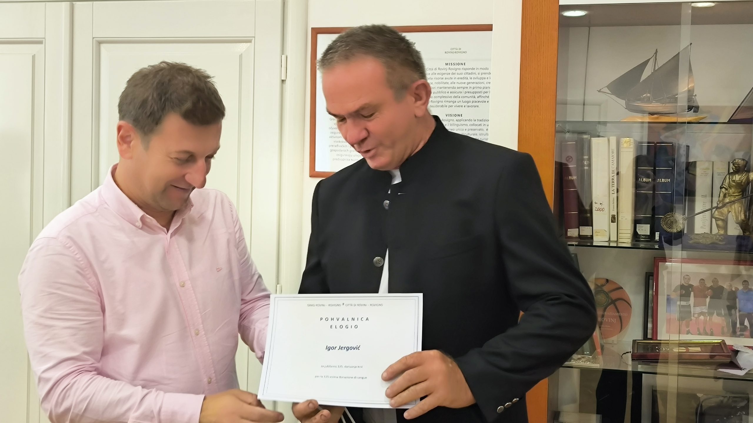 Uoči Dana dobrovoljnih darivatelja krvi, koji se svake godine obilježava 25. listopada, u Gradskoj palači u Rovinju-Rovigno održan je tradicionalan svečani prijem za jubilarne darivatelje krvi. Gradonačelnik Emil Nimčević tom je prilikom zahvalio sugrađanima koji svojim činom darivanja krvi spašavaju živote i daju primjer nesebičnosti, solidarnosti i humanosti.